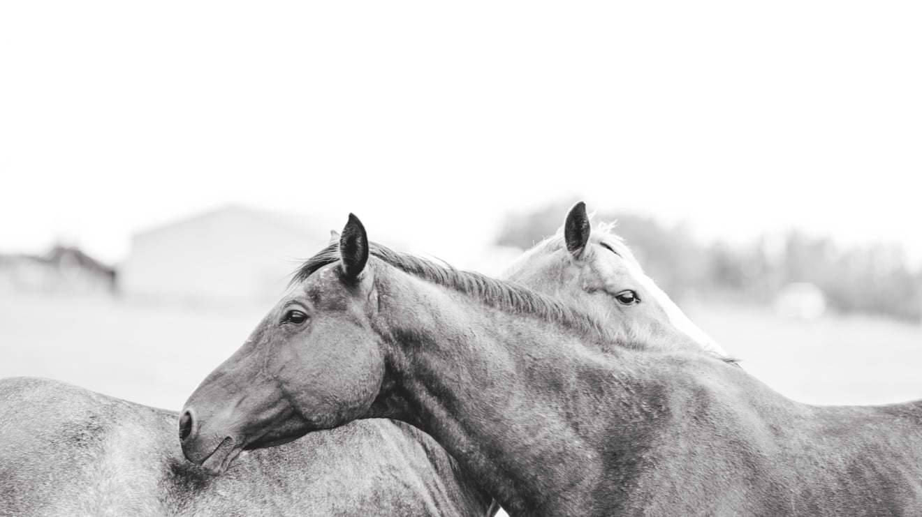 A black and white photograph of two horses,